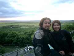 おっと、まだ時間が早いので観光を、と思いオーナーにいろいろ情報を教えてもらう。特製「酔いどれマップ」を頂き、「細岡展望台」へ行くことに。、どうやら宿の前の道をひたすらまっすぐ行くとR391へ出られるらしく、夕日が絶景だそうです。あと、釧路と言えば炉端焼き。市内を流れる釧路川の岸壁に名物炉端があるそうなので後で行ってみることに。とりあえず荷物とモンスターを預け、タンデムで細岡展望台を目指す。 細岡展望台へはR391からやや細い道を走る。ここが何となくに印象深い道で、湿原を通る釧路本線や「達古武沼」があったりと、何となく懐かしさを感じる道。そんな道を15分ほど走ると細岡の駐車場へ到着した。そして展望台へ。展望台からは釧路湿原が見渡せ、遠くには十勝の山々、阿寒富士や雄阿寒岳、雌阿寒岳などが眺められます。もちろん手前には壮大な釧路湿原が見えます。時刻は4時過ぎ、日没まであと2時間。地元のプロカメラマン場が大きな望遠レンズを抱えて集まってきます。それ程素敵な夕日なのです。 何もせずにただボーっと湿原を眺めながら、会話と言えば「凄い景色だねぇ〜来て良かったねぇ〜」そんなある意味、贅沢な時間を過ごし、段々日が傾き始めていた。近くのカメラマンが「ん〜今日は焼けそうもないなぁ」と話していた。どうやら雲の状態が良くないらしく壮大な夕焼けはお預けらしい。あと30分もすれば夕日の時間だ、オイラはよっしーと相談して細岡を後にした。(夕日が見られず、残念!でもコレばっかりはねェ…) |