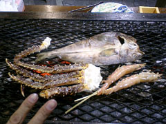 細岡を後に釧路市内へ戻った。取りあえず、その名物炉端の店を探した。そこは呆れるほど大きく、すぐに見つかった。 店員さんに案内されて炉を確保。システム的には全てチケット制で自分で好きなものを店(市場みたいに魚が並んでる)で買い、自分で焼いて食べるのだ。早速チケットを購入。ビール、ほっけ、蟹、海老、など買い焼く。どれも新鮮で「ん〜んまぁ〜い!」思わずビールがぶ飲みでした(汗) |